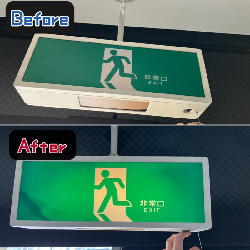 消防点検を行った際に、誘導灯の蓄電池が切れていることが判明し、交換させていただきました。