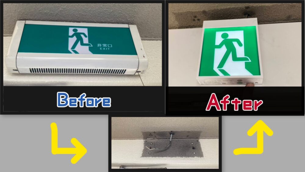 誘導灯の蓄電池が切れており、蓄電池を交換すると共にLEDの誘導灯に付け替えることとなりました。