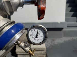 送水口から送水し、ゆっくりと圧力を上げ、規定の圧力を示すか確認します。